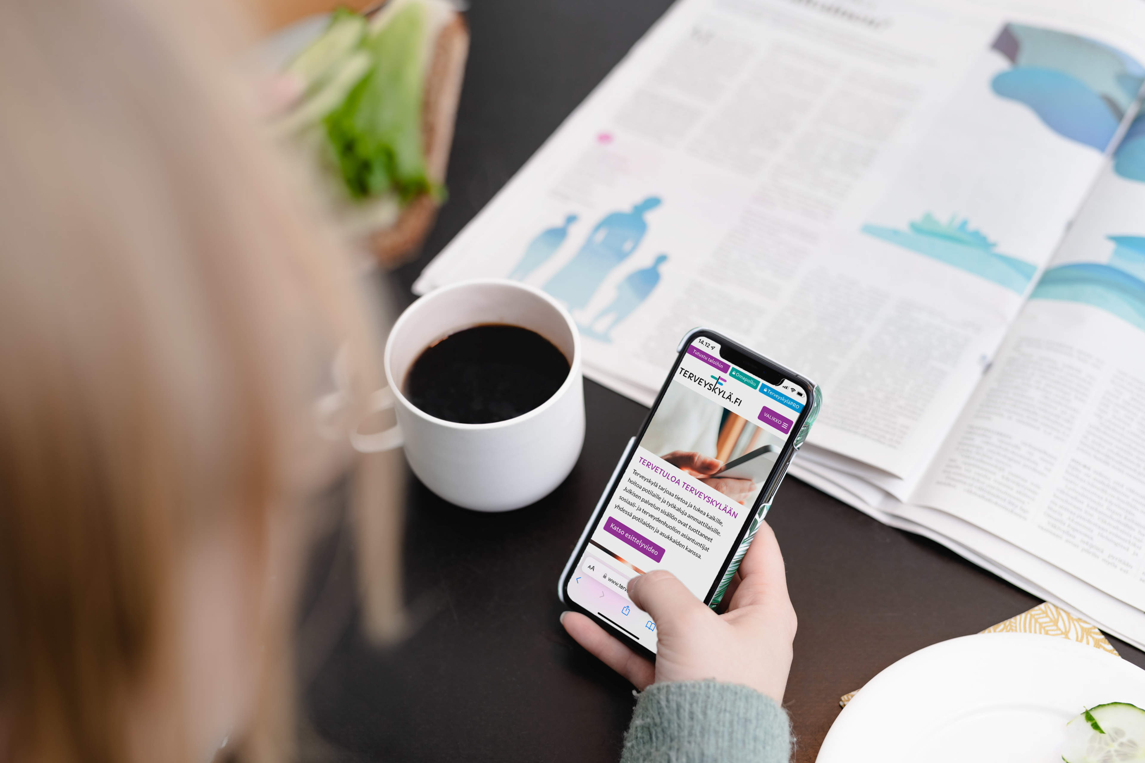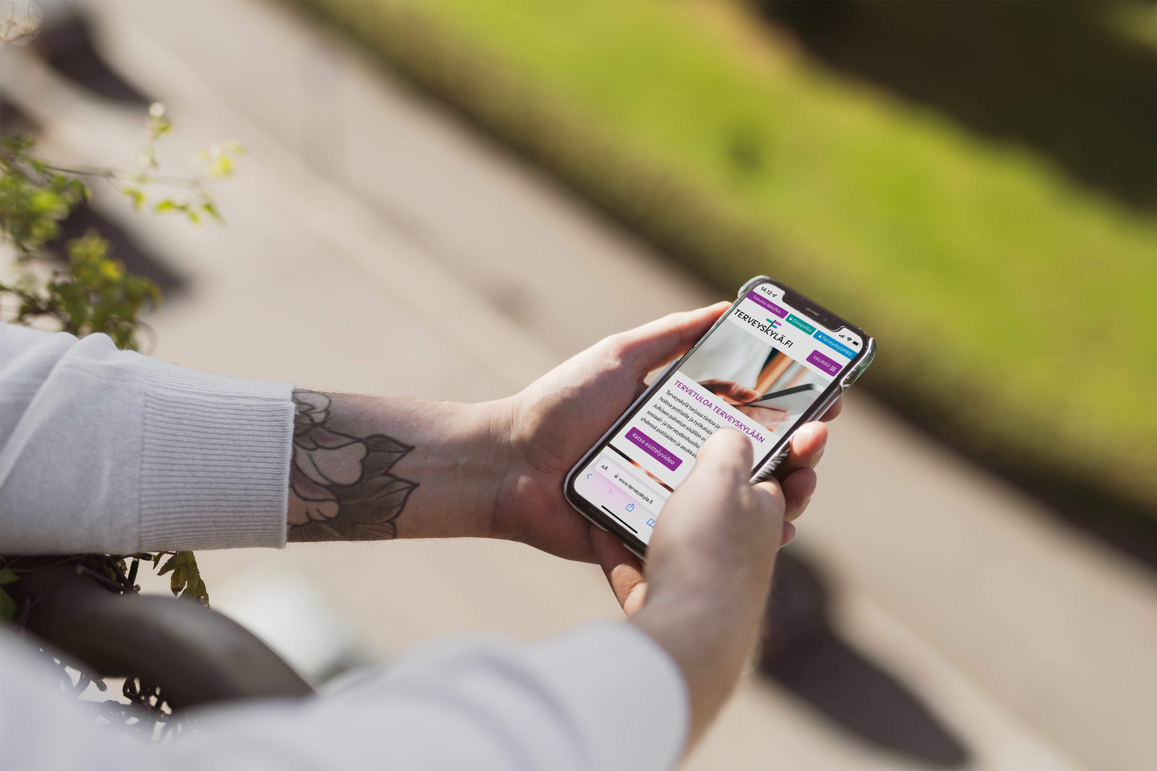 Mobile phone with the home page of Terveyskylä.fi or Hälsobyn.fi